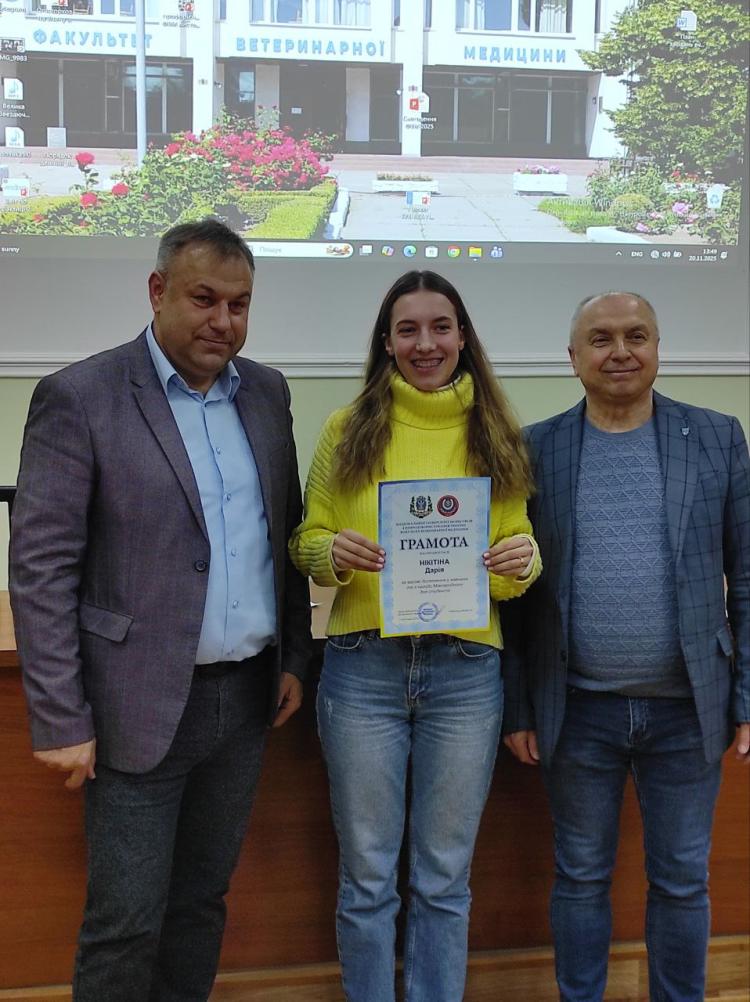 20 листопада 2025 року під час чергового засідання Вченої ради факультету ветеринарної медицини НУБіП України відбулося урочисте вручення відзнаки студентці 5 курсу, старості 10 групи Дарії Нікітіної.