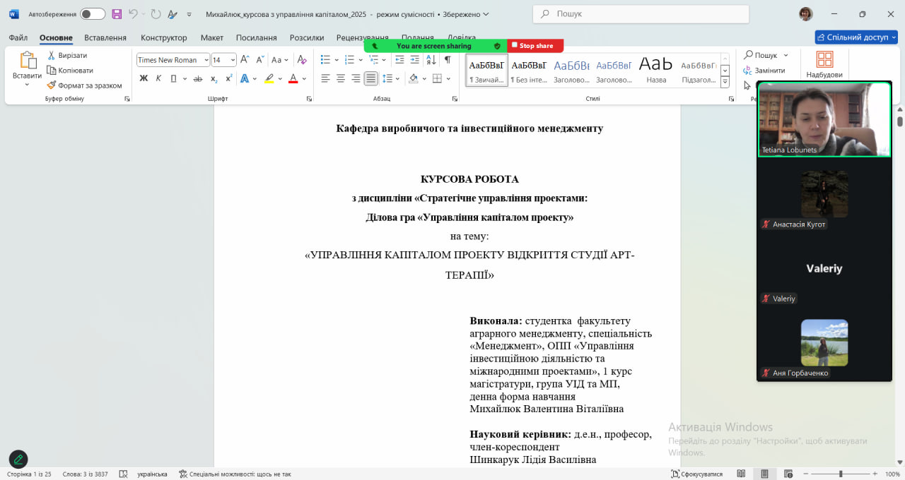 У межах академічної підготовки Тетяна Валеріївна повідомила, що протягом весняного семестру студенти працюватимуть над курсовими роботами з дисципліни «Управління капіталом проєкту». Підкреслено, що виконання цих робіт є важливим етапом підготовки до написання магістерських кваліфікаційних досліджень. Наставник нагадала про вимоги до підготовки наукових праць, необхідність дотримання академічної доброчесності, самостійність виконання досліджень та категоричну недопустимість плагіату.
