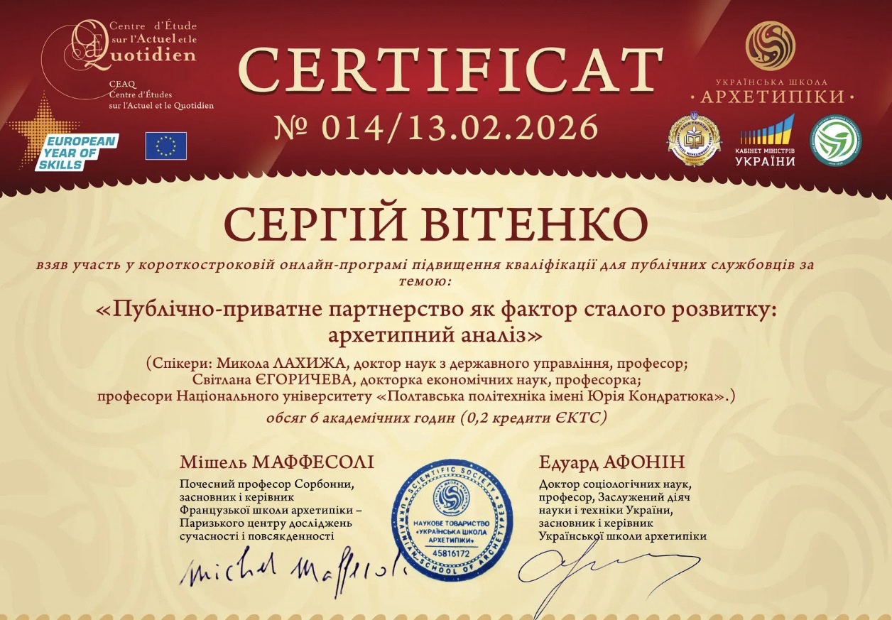 13 лютого 2026 року аспірант 1 року навчання Сергій ВІТЕНКО пройшов курс-інтенсив з підвищення кваліфікації за спеціальністю D4 «Публічне управління та адміністрування» на тему: «Публічно-приватне партнерство як фактор забезпечення сталого розвитку: архетипний аналіз». Ініціаторами заходу є наукове товариство «Українська школа архетипіки», Університет менеджменту освіти НАПН України, Дніпровський інститут медицини і громадського здоров’я та Національний університет «Полтавська політехніка імені Юрія Кондратюка».