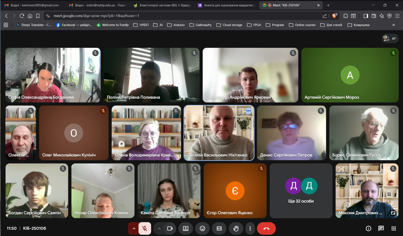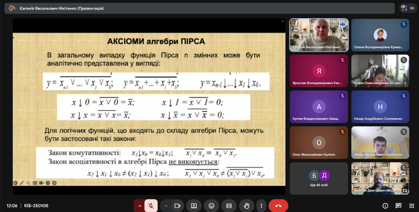 04 березня 2026 року об 11:50-13:10 проведена відкрита лекція з дисципліни «Комп’ютерна логіка-1» доцента кафедри комп’ютерних систем, мереж та кібербезпеки, кандидата фізико-математичних наук, доцента Євгенія НІКІТЕНКА для студентів 1-го курсу факультету інформаційних технологій (спеціальності F5 – Кібербезпека та захист інформації та F7 – Комп’ютерна інженерія, ОC Бакалавр) на тему: «Базиси Шефера та Пірса». Лекція відбулася у дистанційному форматі на платформі Google Meet.