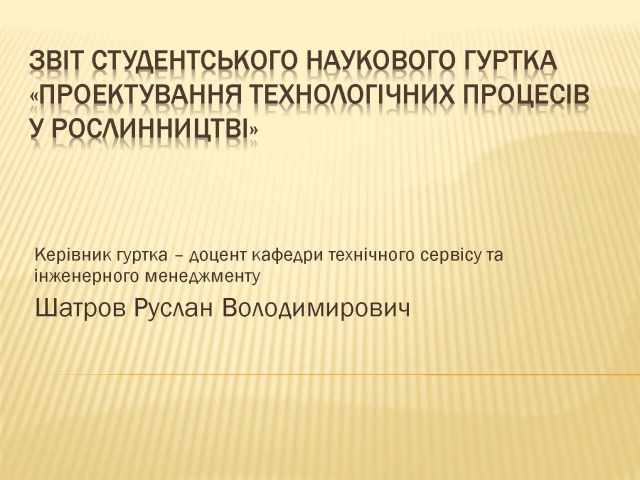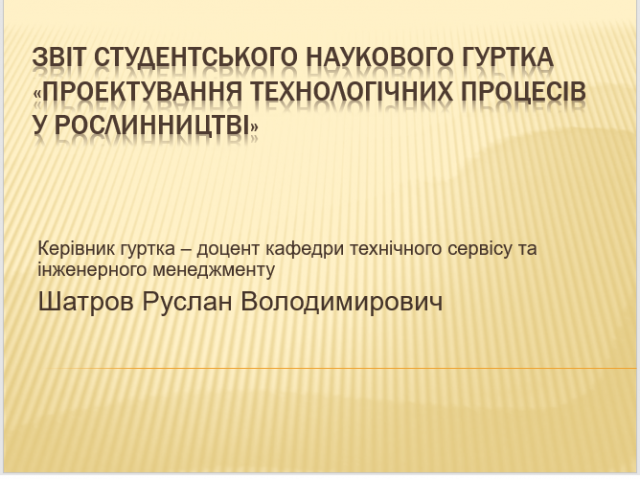 про роботу наукового студентського гуртка «Проектування технологічних процесів у рослинництві» по кафедрі технічного сервісу та інженерного менеджменту за 2015-2016 навчальний рік