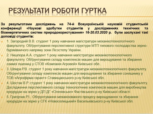 8. Підготовка і заслуховування доповідей студентів на 71 наукво-практичній студентській конференціїї "Наукові здобутки студентів у дослідженнях технічних та біоенергетичних систем природокористування" | 20.03.2017 28.03.2017 |