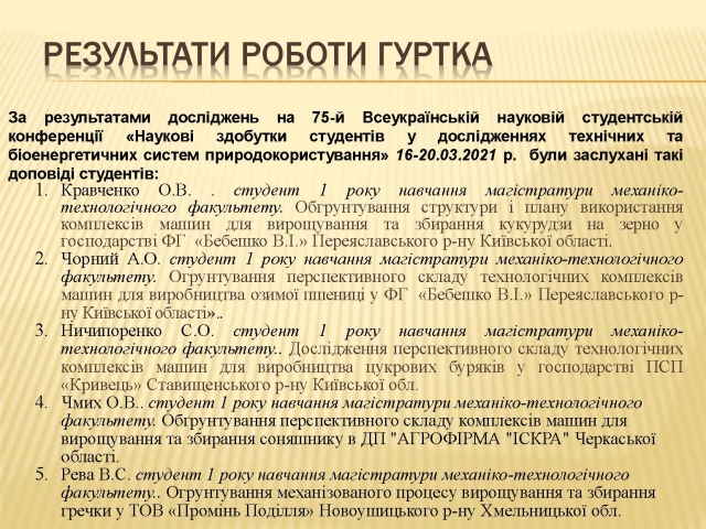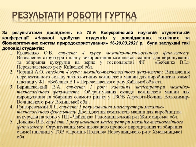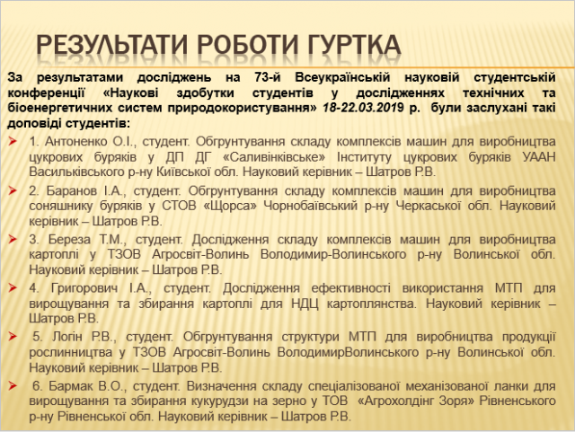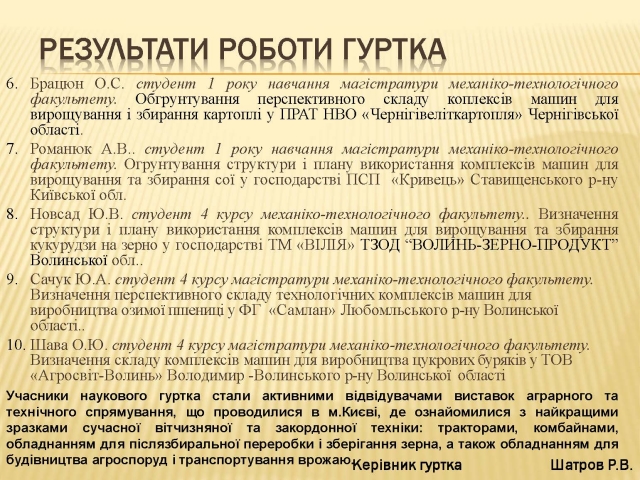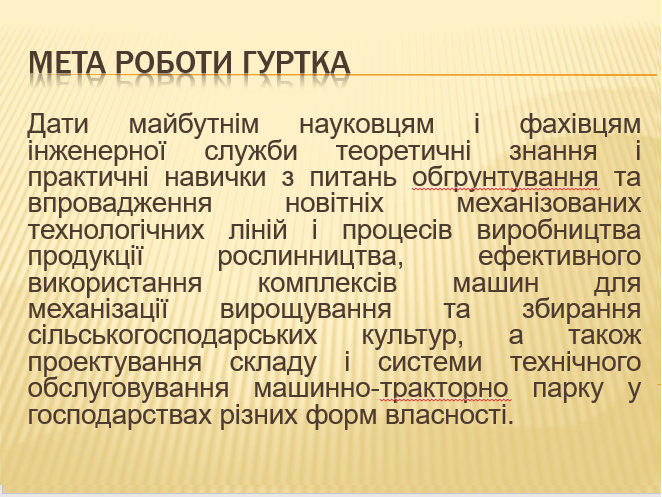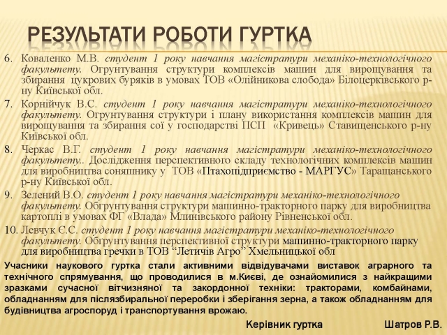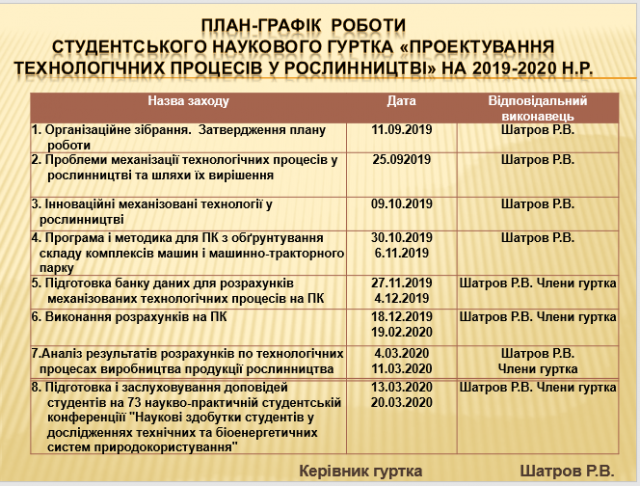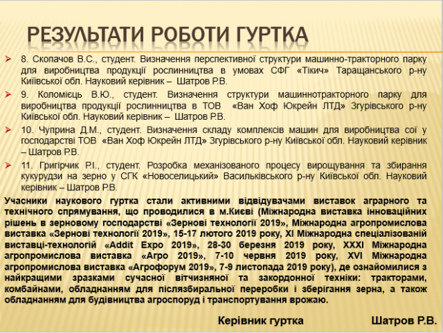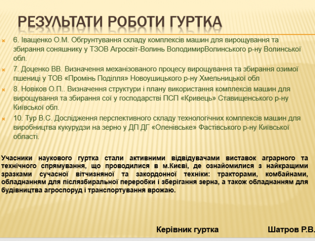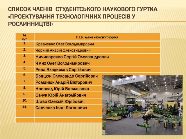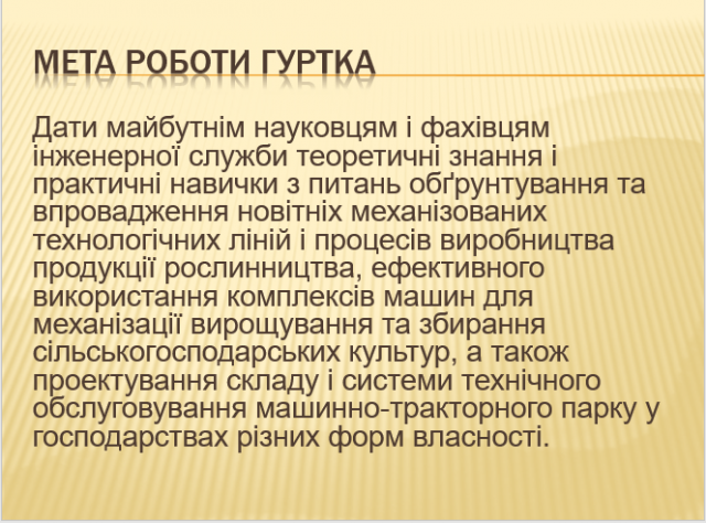Наукова спрямованість гуртка – дослідження технологічних процесів, перспективних складів комплексів машин і машинно-тракторного парку для механізованого виробництва продукції рослинництва.