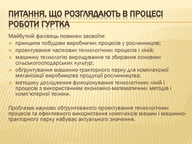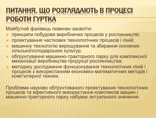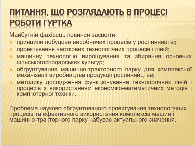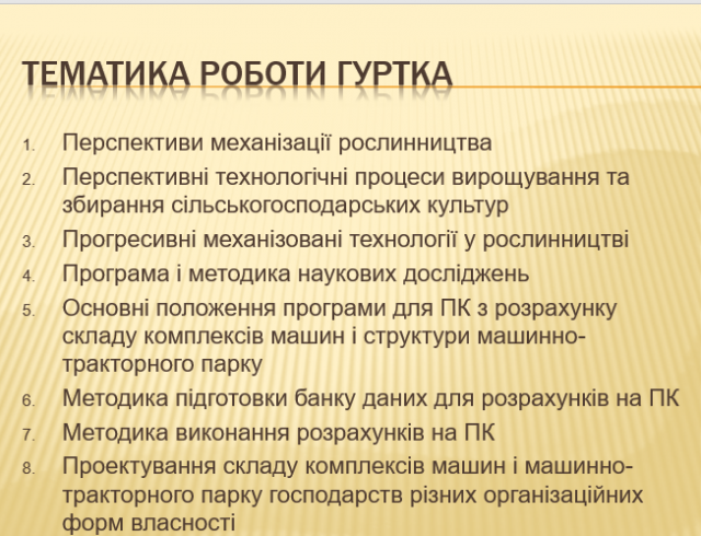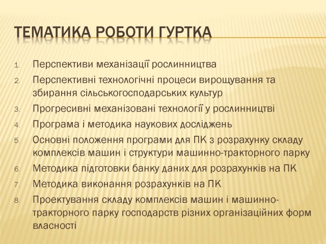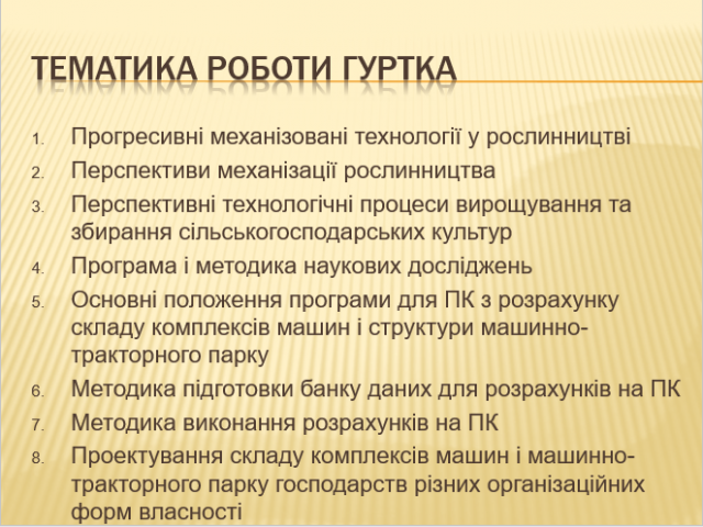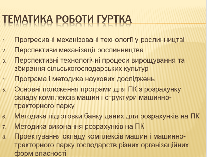 Тема - дослідження технологічних процесів та перспективних складів комплексів машин для механізованого виробництва сільськогосподарських культур.