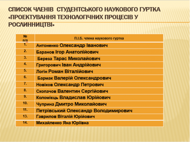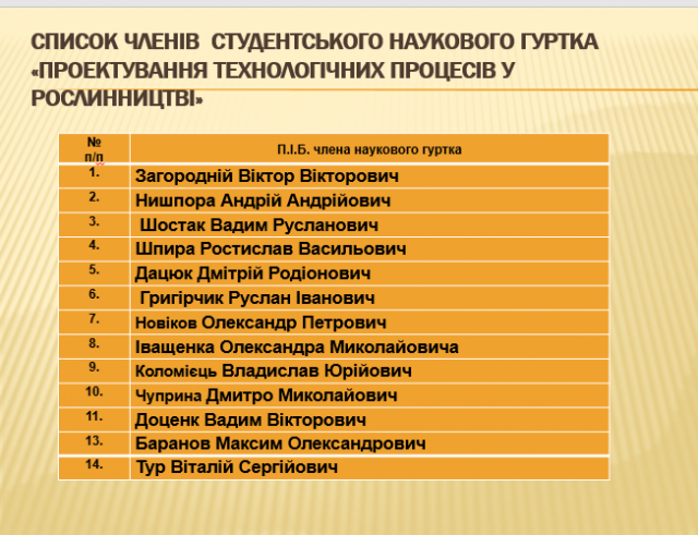 членів студентського наукового гуртка «Проектування технологічних процесів у рослинництві» кафедри технічного сервісу та інженерного менеджменту на 2016-2017 навчальний рік