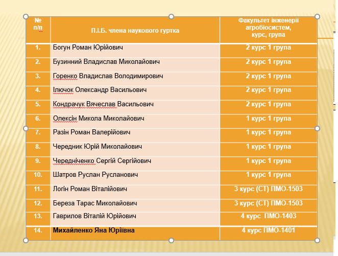 № п/п | П.І.Б члена наукового гуртка | Факультет інженерії агробіосистем, курс, група | |