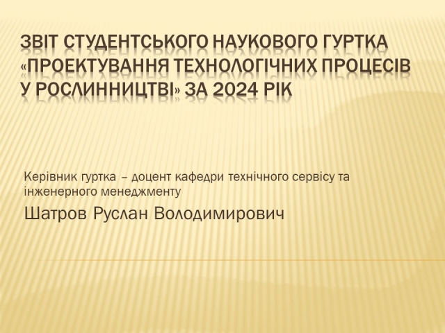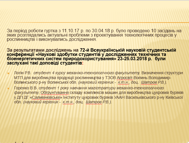 про роботу наукового студентського гуртка «Проектування технологічних процесів у рослинництві» по кафедрі технічного сервісу та інженерного менеджменту за 2016-2017 навчальний рік