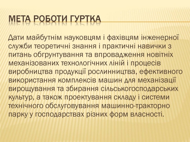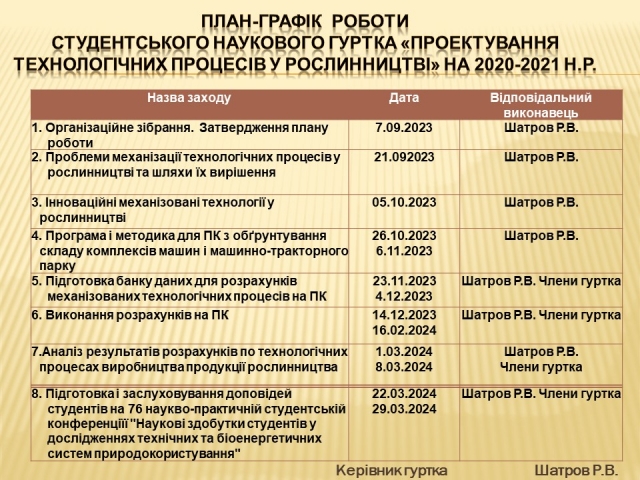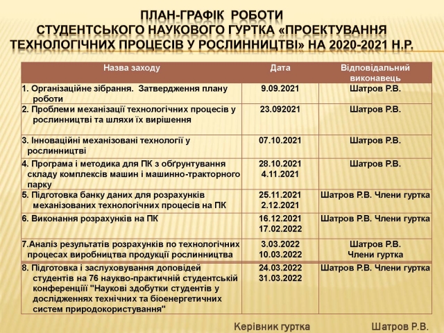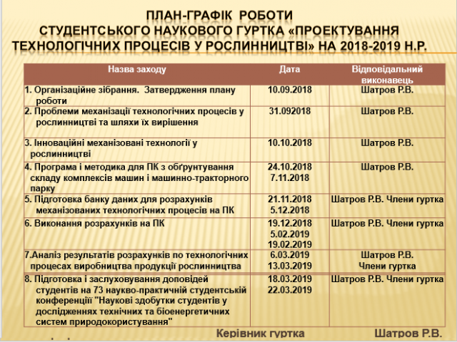 Мета роботи гуртка "Проектування технологічних процесів у рослинництві" – дати майбутнім науковцям і фахівцям інженерної служби теоретичні знання і практичні навички з питань обгрунтування та впровадження новітніх механізованих технологічних ліній і процесів виробництва продукції рослинництва, ефективного використання комплексів машин для механізації вирощування та збирання сільськогосподарських культур у господарствах різних форм власності.
