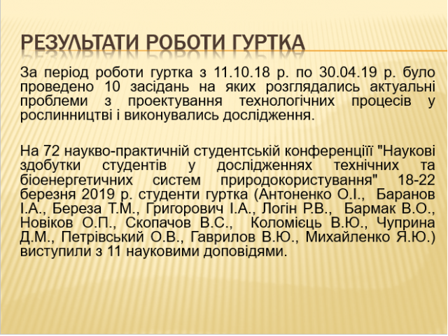 До складу гуртка входило 12 студентів факультету інженерії агробіосистем.