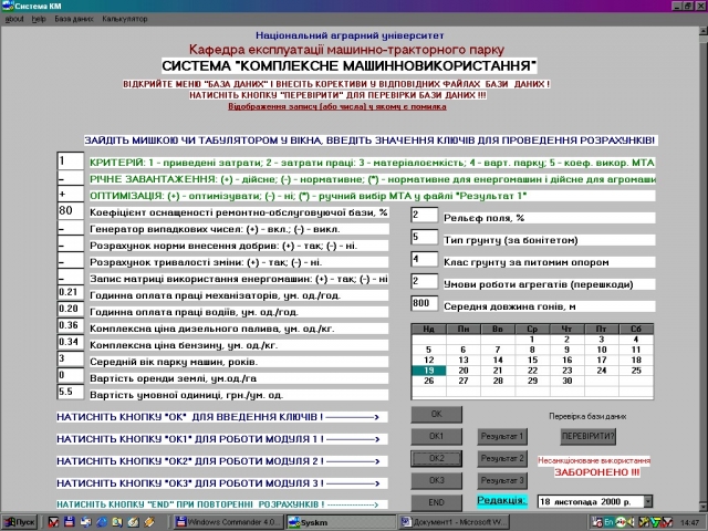 Для рішення задачі на ПК необхідно попередньо виконати інсталяцію пакету прикладних програм SKM та базу даних, яка складається із п’яти файлів: MATR.KULT, ENERGET.SKM, MASHYNY.SKM, OPERAGREGAT.SKM, SILGOSKULTURY.SKM, TEXNOLOGKULT.SKM.