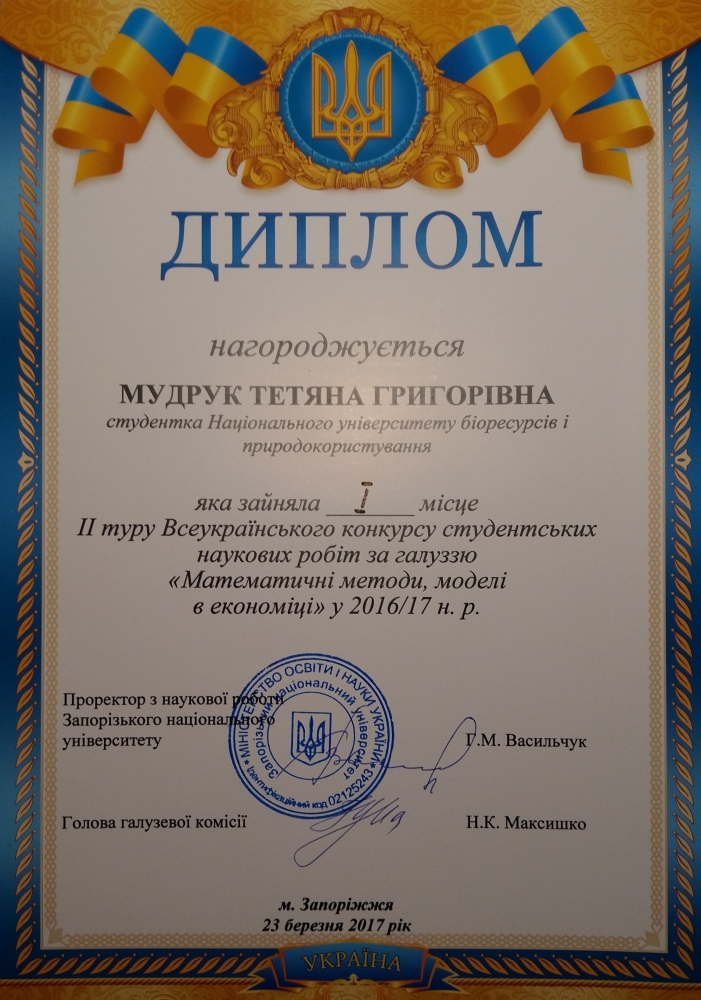 Перемога у II турі Всеукраїнського конкурсу студентських наукових робіт за галуззю «Математичні методи, моделі в економіці».