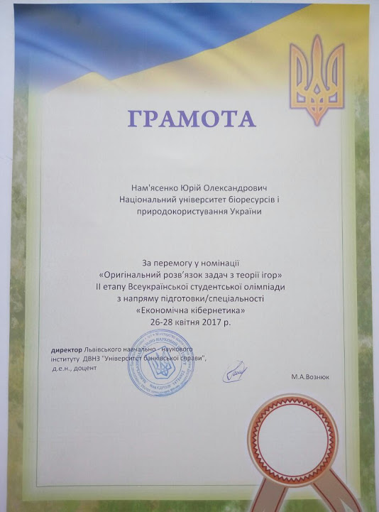 Студент 4 курсу спеціальності «Економічна кібернетика» Юрій Нам’ясенко отримав грамоту за перемогу в номінації «Оригінальний розв’язок задач з теорії ігор».