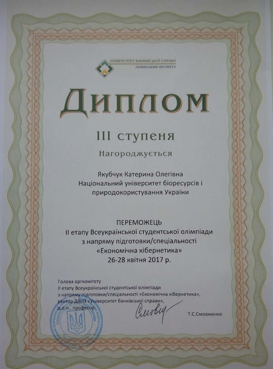 Магістр з «Економічної кібернетики» Катерина Якубчук виборола 3 місце в II-й етапі Всеукраїнської студентської олімпіади зі спеціальності "Економічна кібернетика".