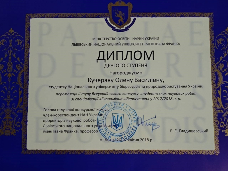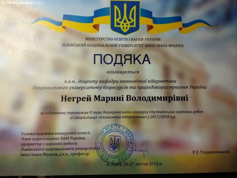 Олена Кучерява була нагороджена Дипломом II ступеня за перемогу у Всеукраїнському конкурсі студентських наукових робіт зі спеціалізації «Економічна кібернетика» у 2017-2018 навчальному році, а її науковий керівник Марина Негрей відзначена Подякою за підготовку переможця II туру Всеукраїнського конкурсу студентських наукових робіт зі спеціалізації «Економічна кібернетика» у 2017-2018 н.р.