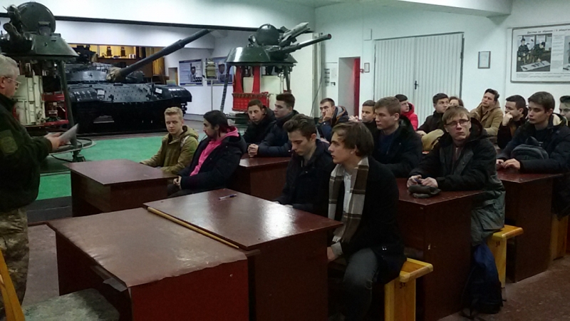 Представник кафедри військової підготовки розповів студентам про танки, зброю, військові заходи та спеціальності за якими здійснює підготовку офіцерів кадру та офіцерів запасу.