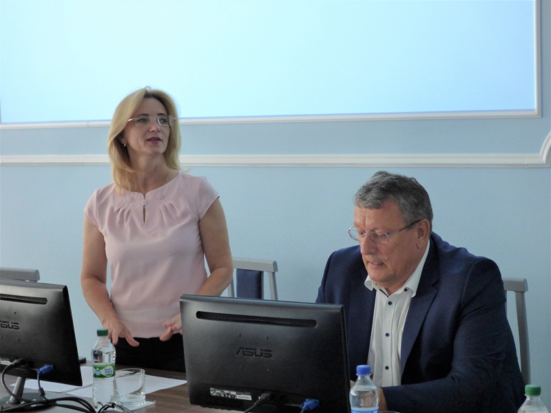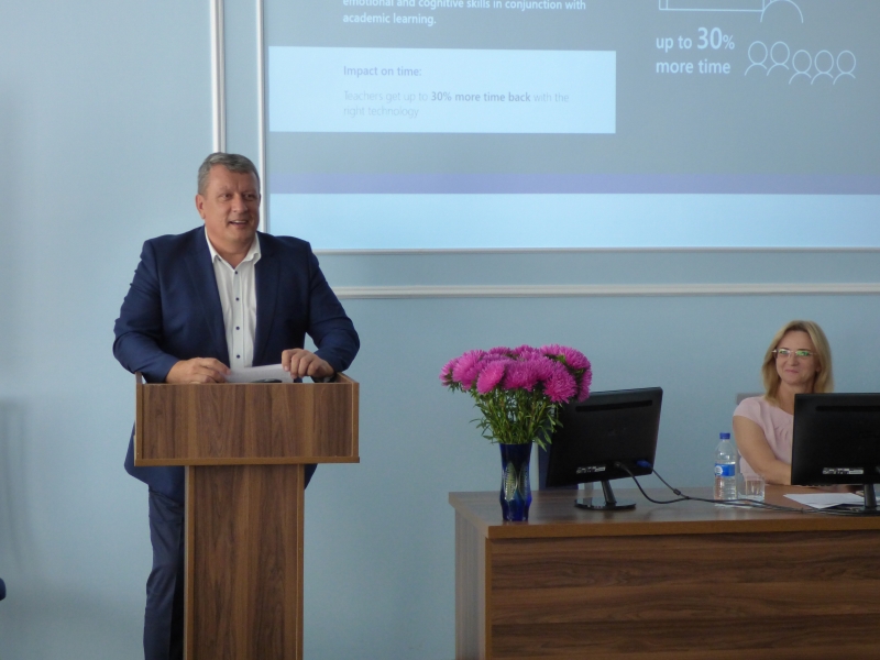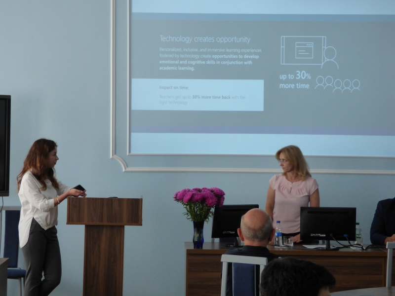 Завідувач кафедри інформаційних і дистанційних технологій, к.пед.н. Кузьмінська О.Г. відмітила, що кафедра хоч і не є випусковою, але на її базі працює декілька лабораторій: Microsoft Imagine Academy, BAS ERP, on-line навчання, госпрозрахункова лабораторія. Всі науково-педагогічні працівники кафедри однаково задіяні у житті як факультету так і університету. Олена Геронтіївна звернулась до представника Microsoft з проханнями: сприяти продовженню співпраці університету і Microsoft Imagine Academy, яка останнім часом дещо змінила формат і це негативно відобразилось на застосуванні саме цього продукту фірми та уможливлення проходження практик студентами на базі компанії Microsoft.