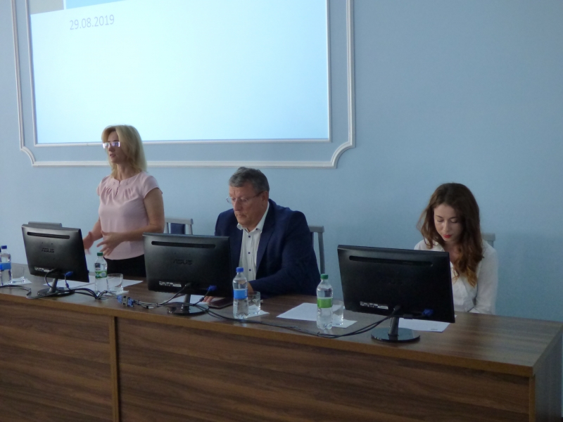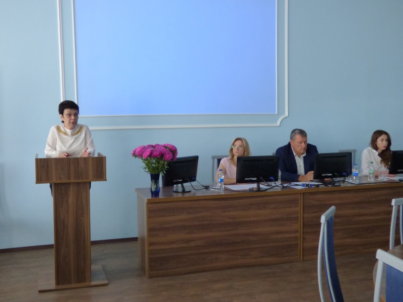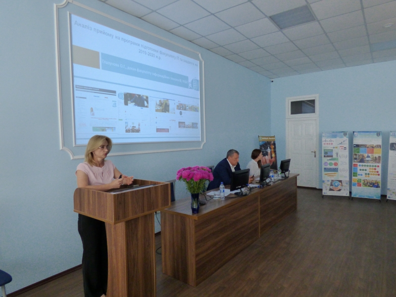 За традицією, засідання відкрила декан факультету Глазунова О.Г., яка, згідно порядку денного, почала свою доповідь з підведення підсумків вступної компанії 2019 року та завдань колективу факультету у новому навчальному році. Олена Григорівна наголосила, що згалом контингент студентів за останні п’ять років збільшився з 527 (2015 р.) до 839 (2019 р.) і займає сьоме місце серед факультетів університету. Зокрема, 220 студентів нового набору ОС «Бакалавр» увійдуть з 1 вересня до аудиторій університету, серед них 21 студент нової спеціальності 125 «Кібербезпека». Олена Григорівна відмітила також, що 50 % вступників на скорочений термін навчання є власниками червоних дипломів. І тому на факультет покладено основне завдання забезпечити якість навчального процесу, кожного дня заходити в аудиторію озброєними практико-орієнтованими завданнями, ідеями для виконання проектів, кейсами з реальними виробничими ситуаціями.