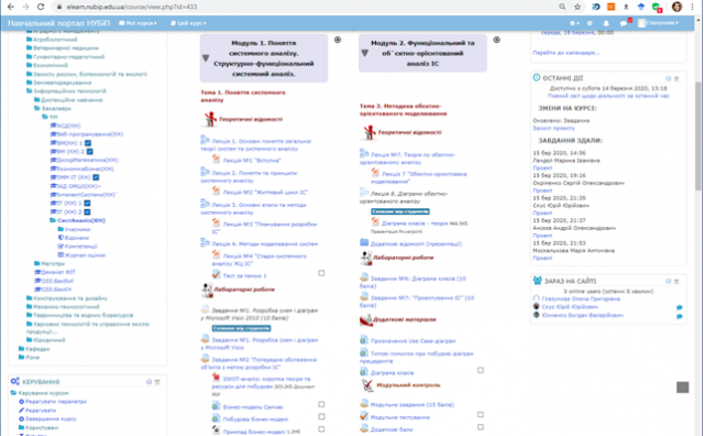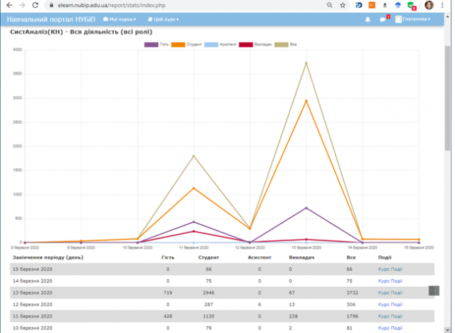Активність студентів і викладачів в кожному курсі при дистанційному навчанні помітно зросла порівняно зі змішаним навчанням, яке використовувалося до оголошення карантину. Це можна спостерігати в розділі «Звіти-Статистика». Наприклад, в курсі «Системний аналіз» за 13 березня було зафіксовано біля 3000 логів студентів, які працювали з ресурсами курсу, відправляли виконані роботи та обмінювалися коментарями з викладачем та одногрупниками.