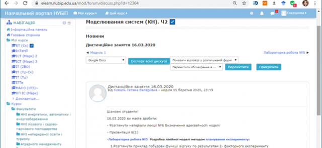 Перш за все в кожному електронному навчальному курсі на навчальному порталі студентам дано роз’яснення щодо організації навчання з дисципліни в умовах карантину. В новинному блоці викладачами регулярно публікуються новини та оголошення, які автоматично надходять на пошту студентам і вони оперативно реагують на виконання відповідних рекомендацій. Таке розповсюдження інформації серед студентів можна ефективно використовувати поряд з комунікацією в групах використовуючи різні месенджери.