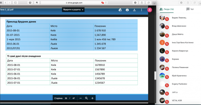 Практична частина заняття була присвячена поняттю «відкриті дані», особливостям обробки «брудних даних», їх очищенню та формування масиву управлінської інформацію.