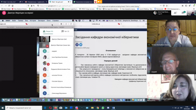 У понеділок, 30 березня 2020 року о 17.00 відбулося перше засідання кафедри економічної кібернетики on-line на базі платформи Meet у формі відеоконференції.