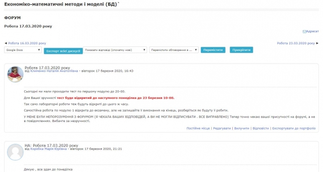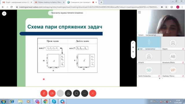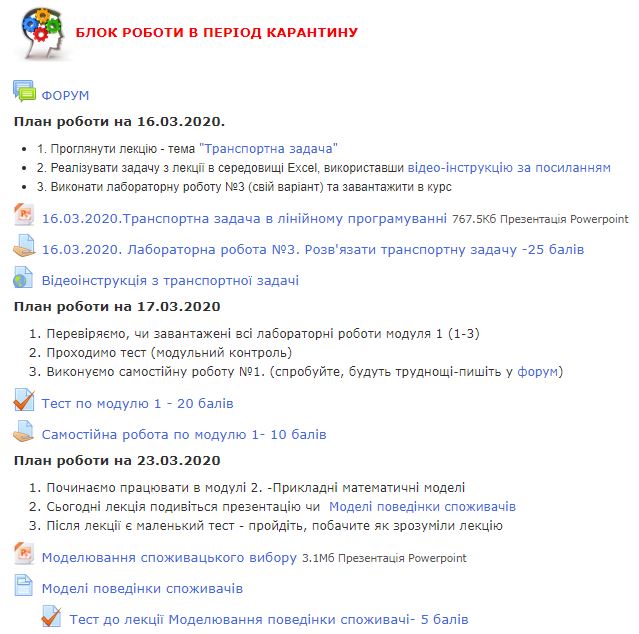 Хочемо поділитися досвідом організації дистанційної роботи з групою студентів економічного факультету за спеціальністю «Підприємництво, торгівля та біржова діяльність» при вивченні дисципліни «Економіко-математичні методи та моделі». З початку семестра студенти працювали в Електронному навчальному курсі, а перших днів карантину ми створи групу в Telegram для зручного спілкування, а в ЕНК зробили блок для роботи під час карантину та в форумі викладаємо план роботи на кожен тиждень. З першого ж тижня постала потреба on-line спілкування, адже опрацювання лекційного матеріалу самостійно студентом– така собі робота. На допомогу залучили Webex Cisco. Думала, що буде важко – у студентів поганий Internet, важко встановити, є небажання підключатися на відео-конференції. Це були марні переживання – молодь є молодь, все нове для них просто, як вони говорять, «на easy». І запрацювали наші регулярні щотижневі зустрічі для обговорення лекційного матеріалу та для консультацій щодо виконання лабораторних робіт. Доречі, дисципліна математична, важка, тому для кращого розуміння методів та реалізації прикладних моделей готуємо з асистентом кафедри економічної кібернетики Костенно Інною студентам відеоінструкції до завдань з лабораторних робіт.