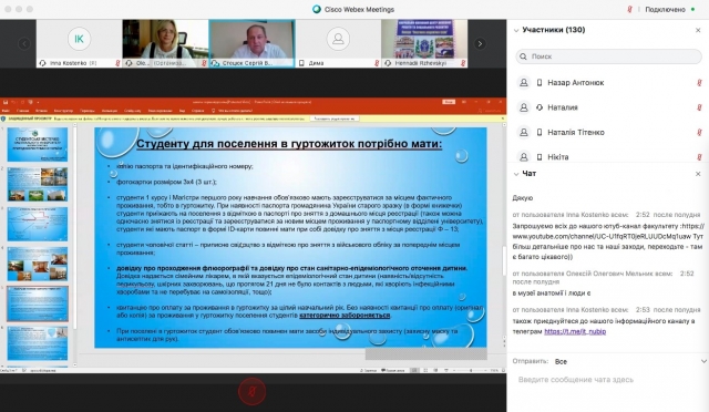 На заверешення заступник декана Тетяна Волошина охарактеризувала ключові дати в навчальному процесі, особливості навчання та поселення в гуртожиток в умовах карантину, наголосила на каналі інформування через телеграм-групи, анонсувала наступну онлайн-зустріч щодо питаннь академічної та соціальної стипендії, можливостей для студентів, що будуть навчатися за контрактом, інших соціальних пільгах та особливостях процедури поселення в гуртожиток.