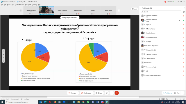 На закінчення зустрічі було представлено результати анонімного анкетування студентів щодо змісту освітніх програм «Економічна кібернетика» та «Цифрова економіка» та обговорення цих результатів зі студентами.