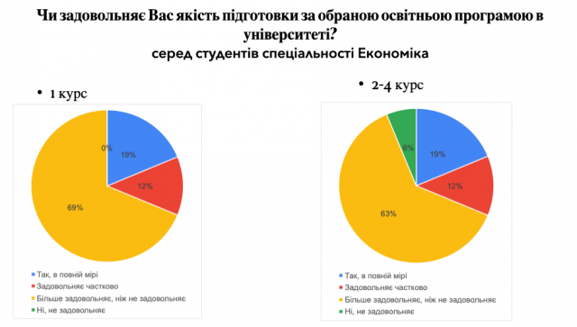 Більшість студентів (94-100%) підтвердили повну або часткову задоволеність якістю підготовки за обраною освітньою програмою в університеті. Зокрема, лише 6% (або 2 особи) серед студентів 2-4 курсів визначили про незадоволеність освітньою програмою, а серед студентів 1 курсів таких не було. Від 63-69% студентів досліджуваних груп, що брали участь у опитуванні відзначили, що запропонована програма «більше задовольняє, ніж не задовольняє» за якістю підготовки.