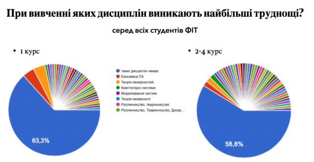 Складність дисциплін, з урахуванням отриманих результатів опитування, розподілене практично рівномірно у межах освітніх компонент запропонованих програм. При цьому у середньому 60% студентів висловили твердження, що дисциплін, що викликають проблеми не існую.