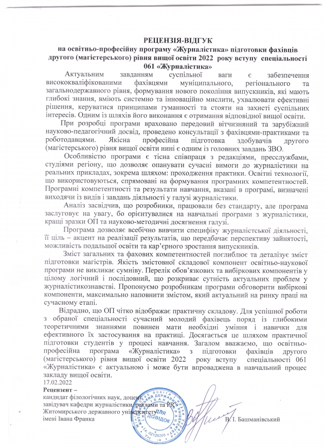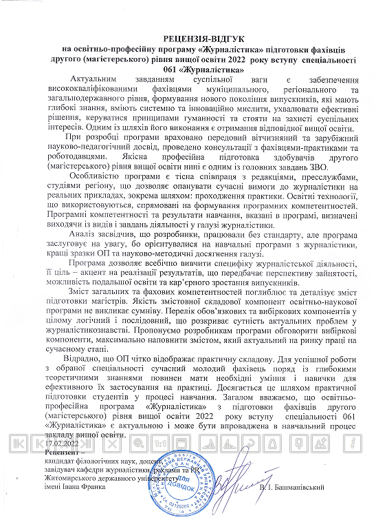 Кандидат філологічних наук, доцент, завідувач кафедри журналістики, реклами та PR Житомирського державного університету імені Івана Франка Валерій Башманівський наголосив на студентоцентрованості програми, відзначив унікальність підходу до формування вибіркових блоків, які відбивають загальну місію університету.