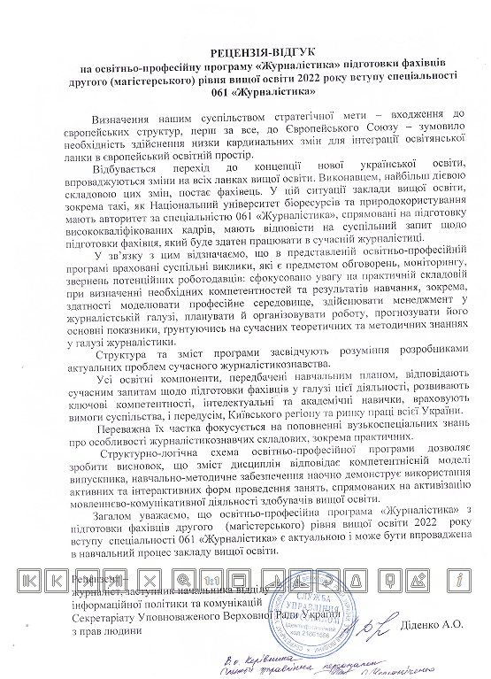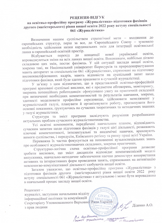 Журналістка, заступник начальника відділу інформаційної політики та комунікацій Секретаріату Уповноваженого Верховної Ради України з прав людини Алла Діденко високо оцінила освітні компоненти програми, зауваживши не тільки на журналістських дисциплінах, але й на міжгалузевому спрямуванні програми. Водночас закцентувала на збільшенні годин на практику.