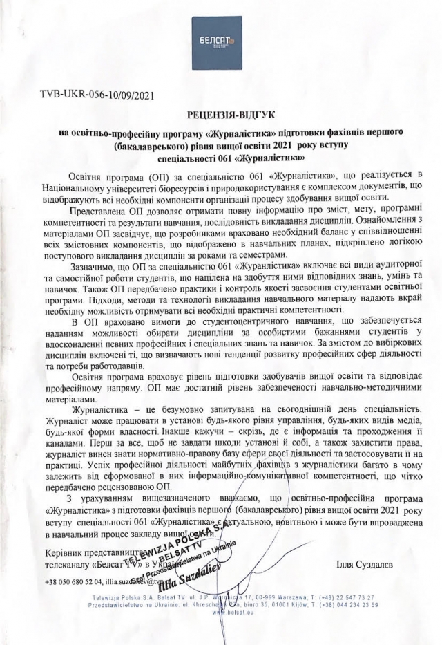 Цього навчального року ОПП «Журналістика» для першого (бакалаврського) рівня успішно пройшла акредитацію, підтвердивши належний рівень якості надання освітніх послуг. Під час оновлення програми на 2022-23 н.р. ураховано пропозиції та рекомендації, надані експертами НАЗЯВО. Зокрема сформульовано програмний результат навчання: «Планувати роботу, використовуючи необхідні знання для провадження безпечної журналістської діяльності в надзвичайних ситуаціях (природного, техногенного характеру, у зоні воєнних дій тощо)», який корелює зі спеціальними компетентностями, визначеними Стандартом вищої освіти України першого (бакалаврського) рівня спеціальності 061 «Журналістика». Вважаємо, що такі зміни є на часі, зумовлені вимогами сьогодення щодо роботи журналіста в надзвичайних умовах і забезпечуються такими компонентами програми: ВК 2.1 «Журналістське розслідування», ВК 2.2 «Безпека журналістської діяльності».