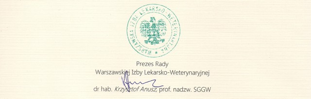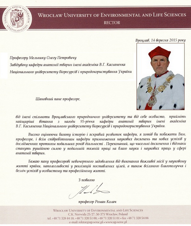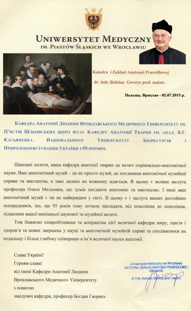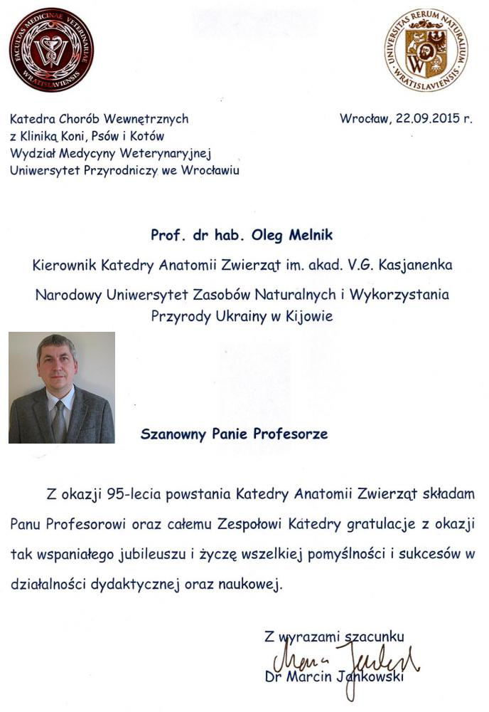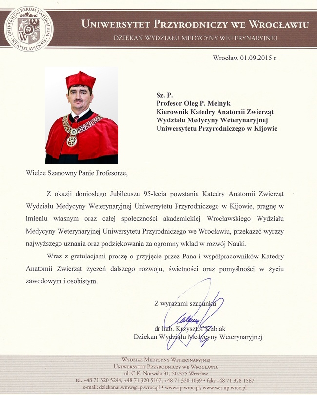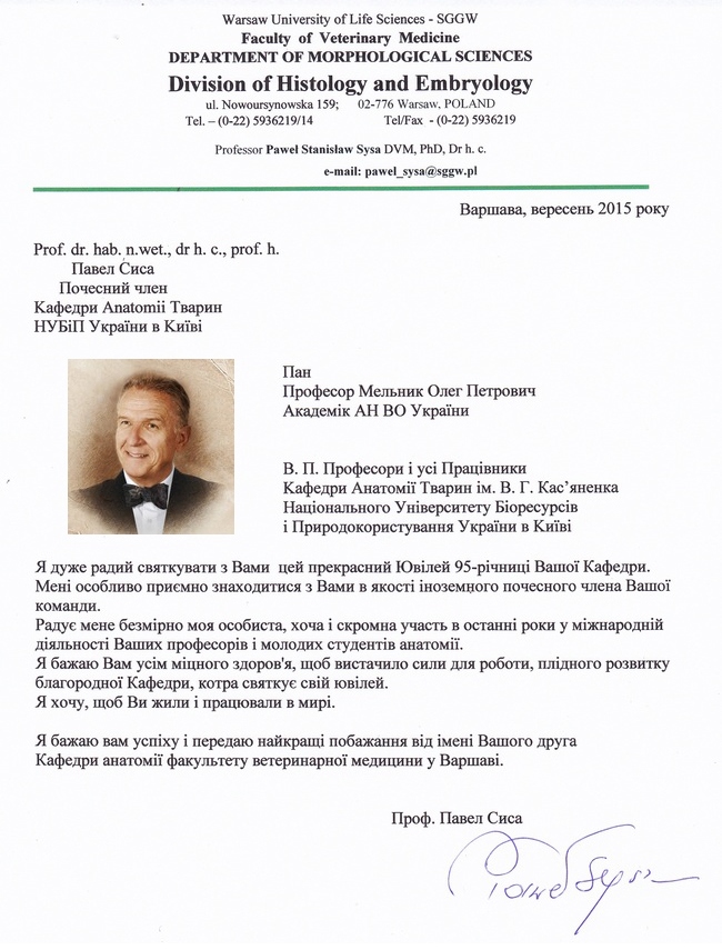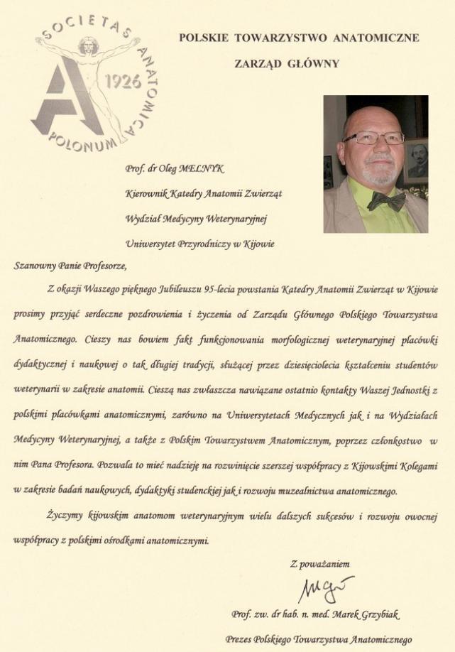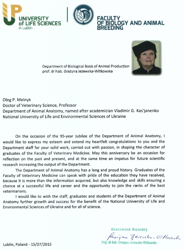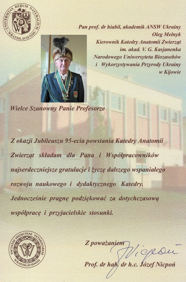 За бажаннням ради Варшавської асоціації лікарів ветеринарної медицини і власним складаю на руки пана професора сердечне вітання для всіх співробітників кафедри з нагоди 95-річчя утворення кафедри нормальної анатомії в складі київської політехніки 10 жовтня 1920 року. Бажаю панству великих здобутків наукових і дидактичних. Маю надію, що міжнародна співпраця зініційована паном професором призведе до серйозного обміну думками, розвитку ветеринарної науки і підготовки наступних поколінь ветеринарних лікарів на найвищому рівні.