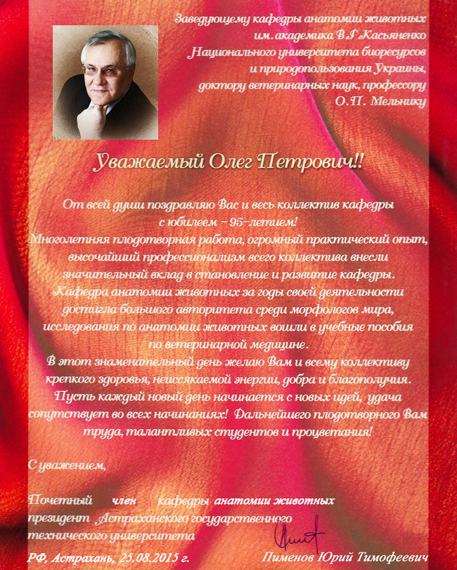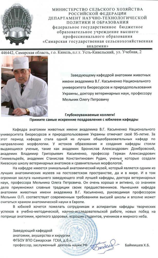 Ваша славетна і всесвітньовідома кафедра святкує своє 95-ти річчя. За ці роки через кафедру пройшли тисячі студентів, що стали ветеринарними лікарями, які працювали і працюють у народному господарстві нашої держави і не тільки. Заслуга кафедри у підготовці майбутніх лікарів ветеринарної медицини величезна, адже, як це було сказано ще на початку XX століття "лікар не анатом не тільки не корисний, але й шкідливий". Крім того, ваша кафедра славетна своїми науковими досягненнями не лише в Україні, але й далеко за її межами. Тут завжди працювали, як у минулі часи, так і нині, віддані своїй справі люди і серед них є немало видатних постатей анатомічної науки. Це зокрема, академіки Б.О. Домбровський і В.Г. Касьяненко, професори Г.А. Гіммельрейх, С.К. Рудик та О.П. Мельник. А що вже й казати про створений професором Мельником О.П. музей анатомії.