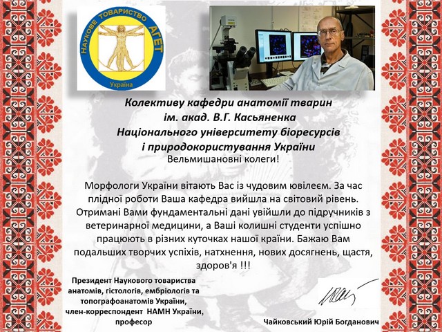 Тож щиро вітаємо колектив кафедри анатомії тварин ім. акад. В.Г. Касьяненка з славною датою в житті Національного університету біоресурсів і природокористування України. Бажаємо Вам миру, натхнення, творчості, нових наукових звершень, відкриттів, підкорити вершини науки, талановитих студентів.