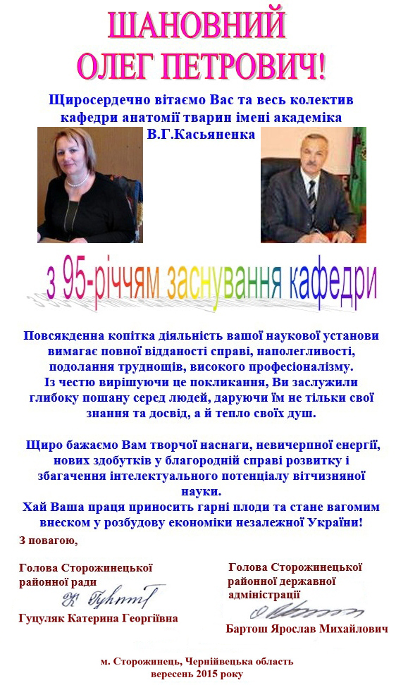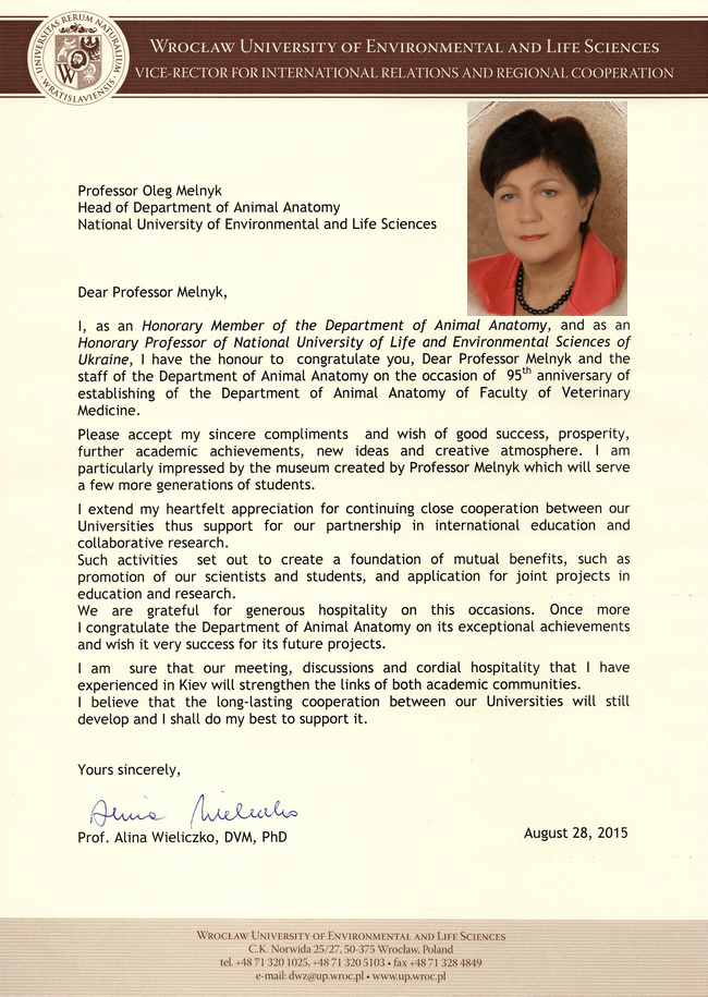 З нагоди 95-річного ювілею кафедри анатомії, я хотіла б висловити Вам та співробітникам Вашої кафедри щирі вітання і повагу, за відданість справі та здійснення фундаментальної роботи у формуванні характеру випускників факультету ветеринарної медицини. Можливо цей ювілей буде приводом для роздумів про ваше минуле і сьогодення, і в той же час стимулом для майбутніх наукових звершень кафедри.