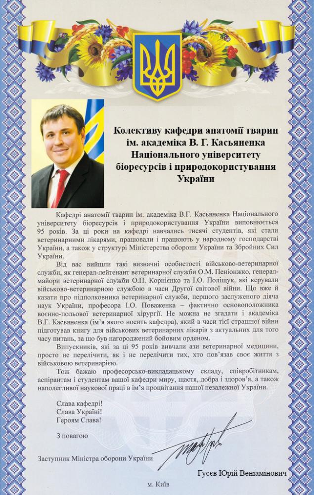 Щиро вітаю Вас та професорсько-викладацький склад кафедри анатомії тварин ім. академіка В.Г.Касьяненка Національного університету біоресурсів і природокористування України зі знаменною подією -95 річчям від дня заснування кафедри! Упродовж десятиліть кафедра анатомії залишається потужним центром освіти і науки, зі стін якої вийшли тисячі спеціалістів, знаних і шанованих не тільки в нашій державі, а й далеко за її межами. 95 років у історичному аспекті - дуже короткий період. Проте цей період був насичений бурхливим життям. Та найголовніше у цьому житті -свято берегти та примножувати традиції попередніх поколінь. Вітаю всіх із славною датою в житті нашого навчального закладу! Бажаю Вам міцного здоров'я, творчого натхнення, здійснення всіх задумів і планів. Зі словами особливої вдячності звертаюся до науково-педагогічних працівників, які завдяки своїм глибоким знанням, безцінному практичному досвіду та самовідданій праці забезпечили Університету визнання й авторитет.