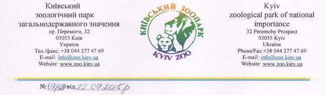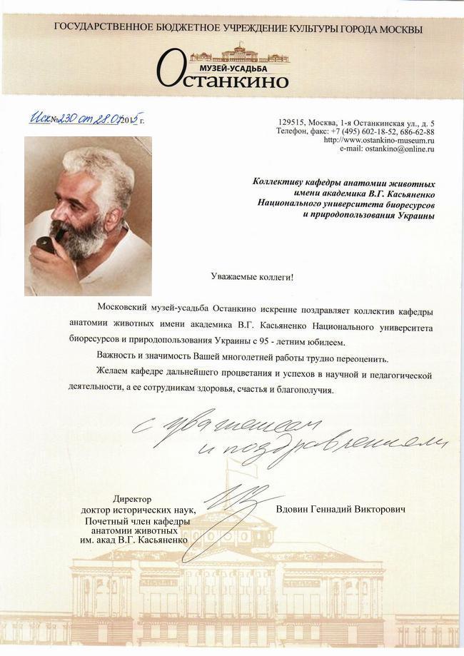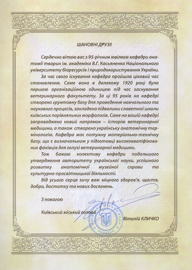 Дирекція та колектив Київського зоопарку щиро вітає очолювану Вами кафедру анатомії тварин ім. академіка В.Г. Касьяненка із знаменною датою - 95-річчя від дня заснування. Бажаємо Вам і всьому колективу кафедри творчої наснаги, стабільності та видатних наукових досягнень. Люди, що працюють на цій кафедрі, є висококваліфікованими спеціалістами, які своєю співпрацею та небайдужим ставленням до справи завжди викликають повагу та вдячність. Здобутки кафедри анатомії дозволяють підвищувати свій рівень не тільки студентам, що навчаються в Університеті, але й іншим фахівцям ветеринарної медицини. Миру Вам та процвітання!