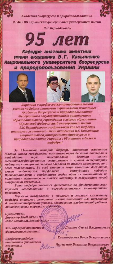 Славетній кафедрі анатомії тварин ім. акад. В.Г. Касьяненка 95 років. За цих 95 років свого існування кафедра стала не просто осередком науки, а справжнім храмом науки та анатомічного музейного мистецтва. В цьому є велика заслуга як попередніх, так і нинішніх поколінь співробітників цієї кафедри. Прийміть мої щирі вітання з цим славним ювілеєм!