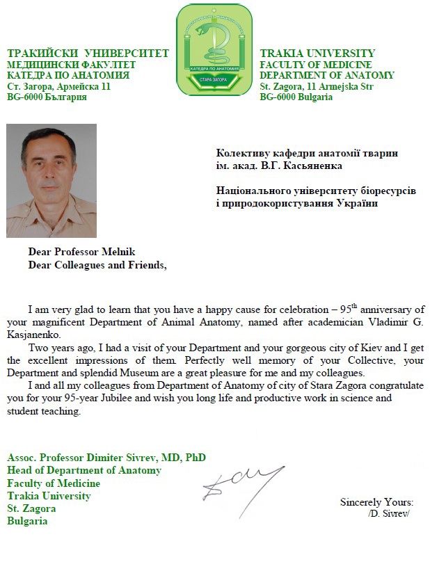 Я дуже радий чути, що Ви святкуєте 95-річницю Вашої пречудової кафедри анатомії тварин ім. В. Г. Касьяненка. Два роки тому я відвідав Вашу кафедру та Ваше розкішне місто Київ та отримав прекрасні враження від цієї поїздки. Я прекрасно пам’ятаю Ваш колектив та Вашу кафедру, а також чудовий музей, що принесло велике задоволення мені та моїм колегам. Я та всі мої колеги кафедри анатомії тварин міста Стара-Загора вітаємо Вас з Вашим 95-літнім ювілеєм та бажаємо Вам довголіття та плідної праці в науці та у навчанні студентів.