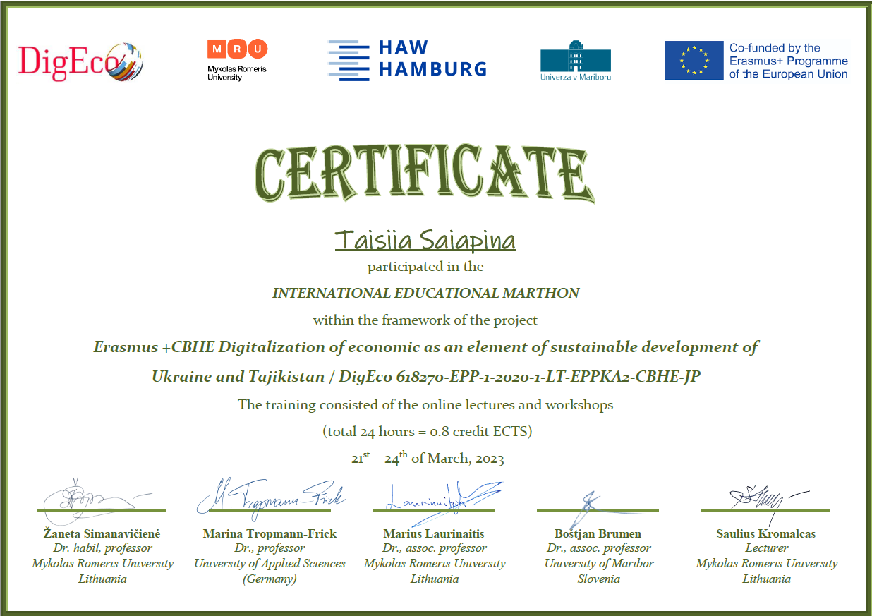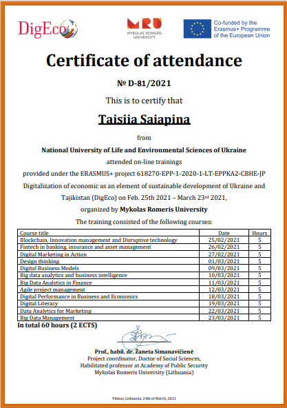 Certificate of attendance № D-81/2021 from 24.03.2021 attended on-line trainings provided under the ERASMUS+ project 618270-EPP-1-2020-1-LT-EPPKA2-CBHE-JP Digitalization of economic as an element of sustainable development of Ukraine and Tajikistan (DigEco) on Feb. 25th 2021 – March 23rd 2021, organized by Mykolas Romeris University