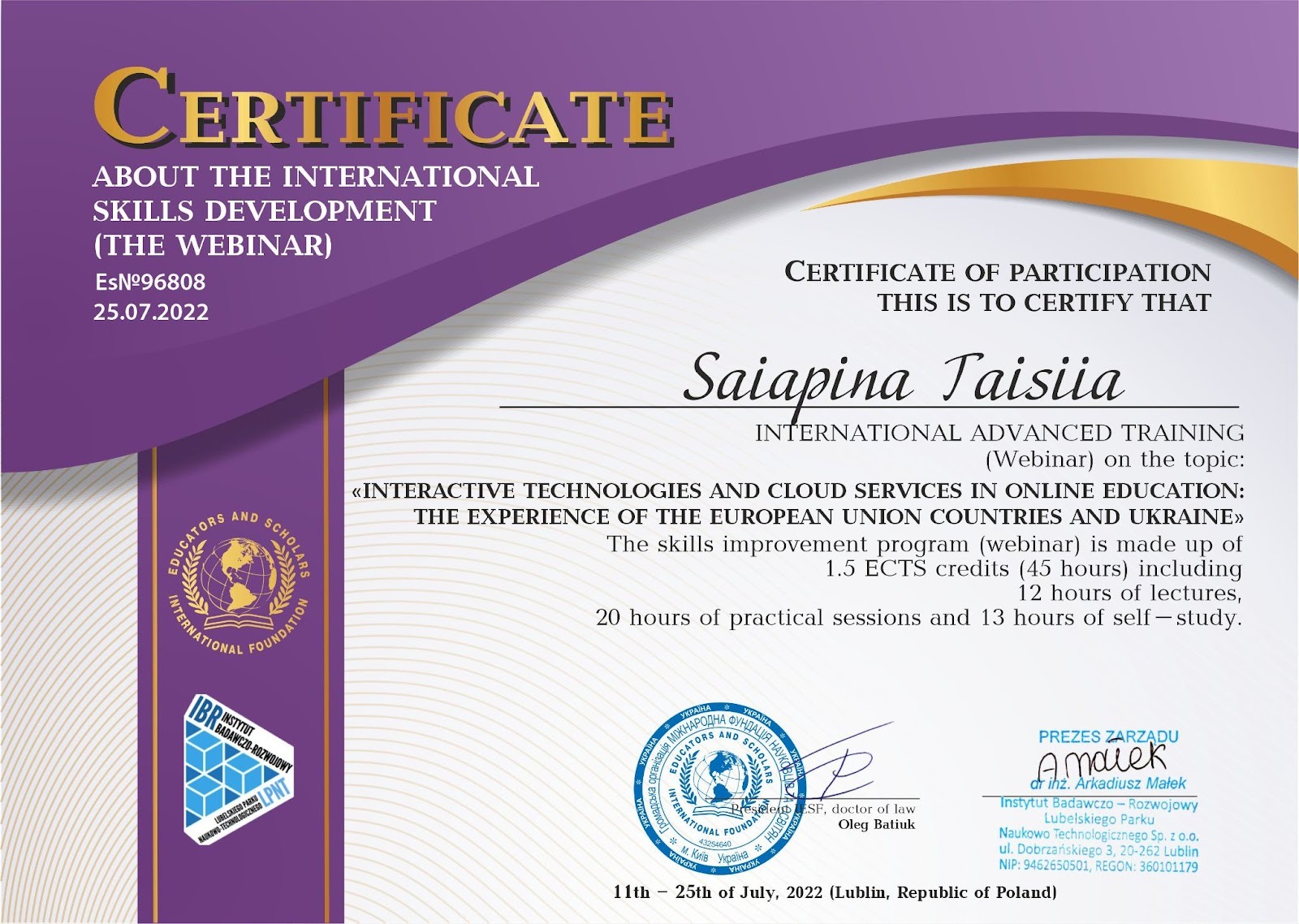 CERTIFICATE ABOUT THE INTERNATIONAL SKILLS DEVELOPMENT (THE WEBINAR) Es№96808 25.07.2022
