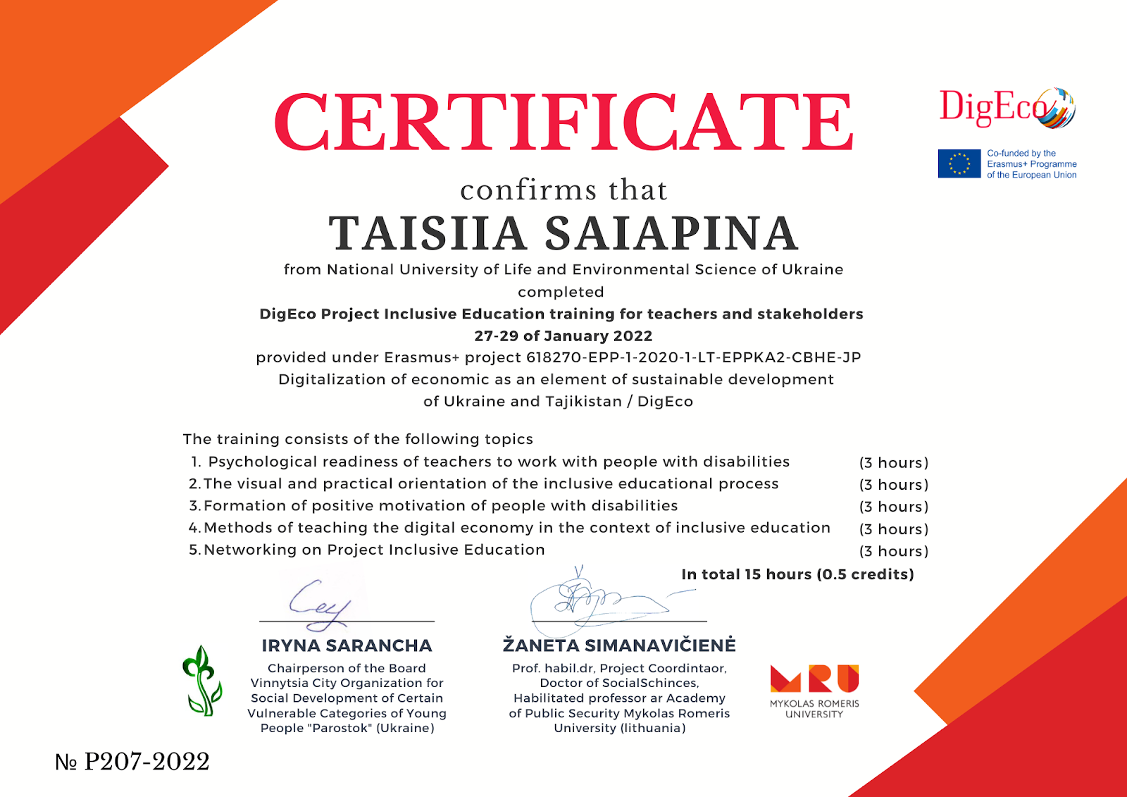 Certificate of attendance № P207-2022 completed DigEco Project Inclusive Education training for teachers and stakeholders providet under ERASMUS+ project 618270-EPP-1-2020-1-LT-EPPKA2-CBHE-JP Digitalization of economic as an element of sustainable development of Ukraine and Tajikistan (DigEco) on Feb. 27th – 29rd January 2022, organized by Mykolas Romeris University