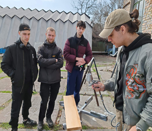 Гуртківців познайомили з налаштуванням до роботи фарборозпилювача компресора, підготовкою лакофарбового матеріалу та деревної поверхні. Також бажаючі могли спробувати свої власні сили в опорядженні виробів.