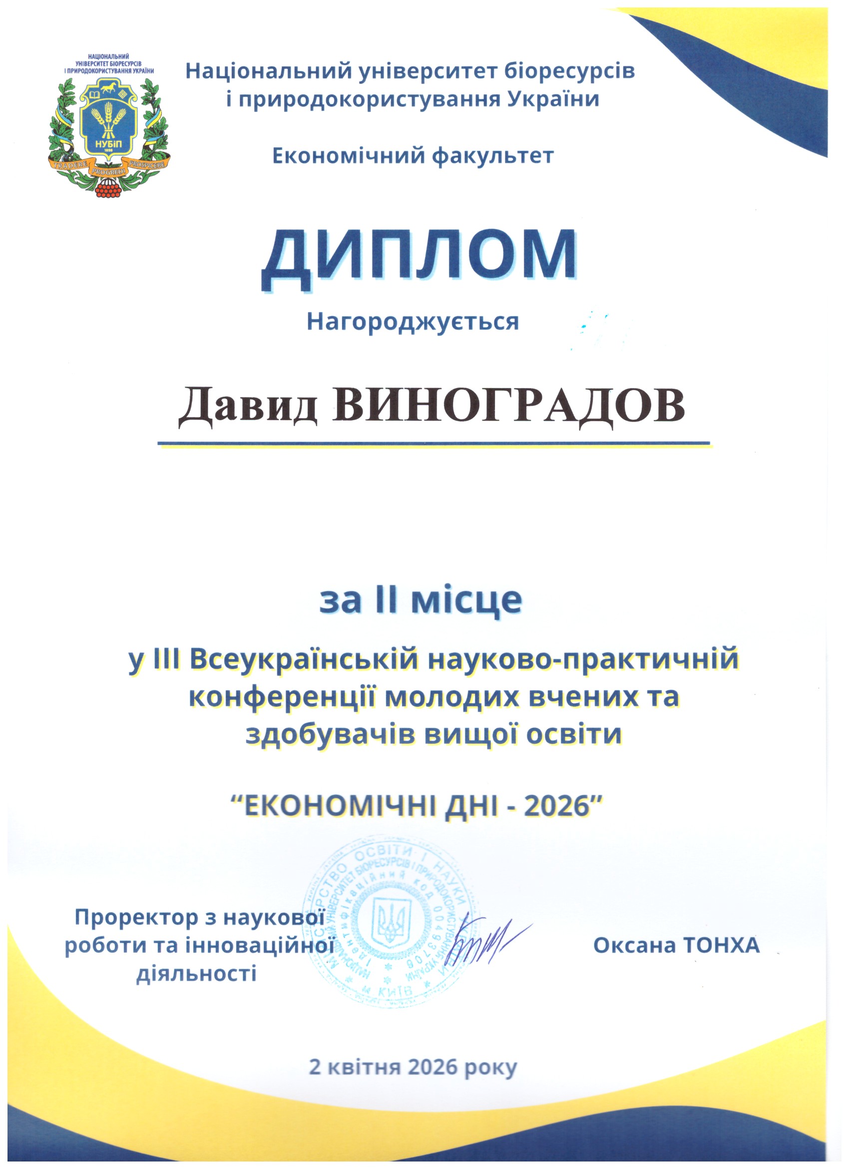 Давид Виноградов - студент 4 курсу спеціальності "Готельно-ресторанна справа" - призер ІІІ Всеукраїнської науково-практичної конференції "ЕКОНОМІЧНІ ДНІ - 2026".