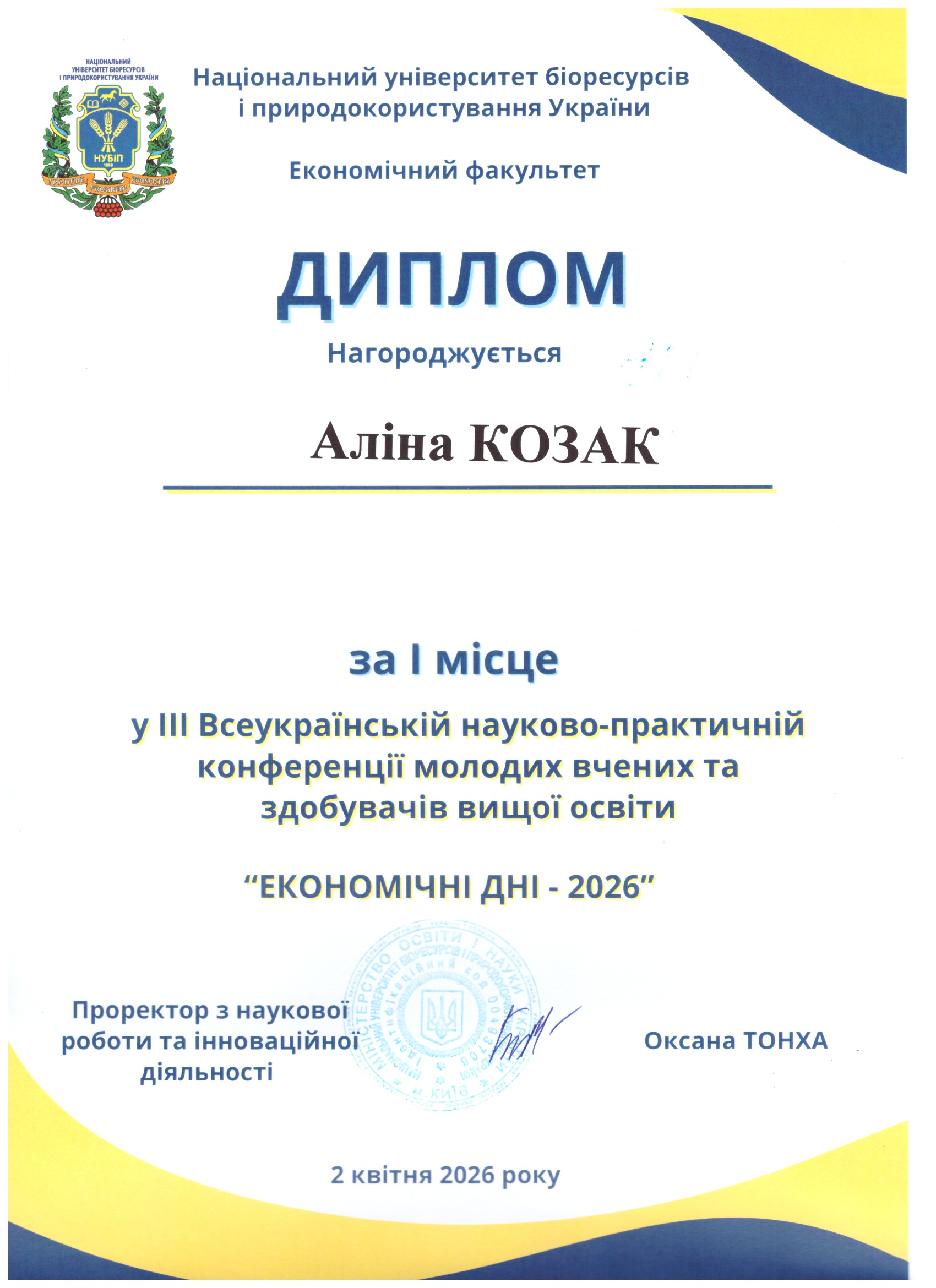 Аліна Козак - студентка 3 курсу спеціальності "Туризм і рекреація" - призер ІІІ Всеукраїнської науково-практичної конференції "ЕКОНОМІЧНІ ДНІ - 2026".