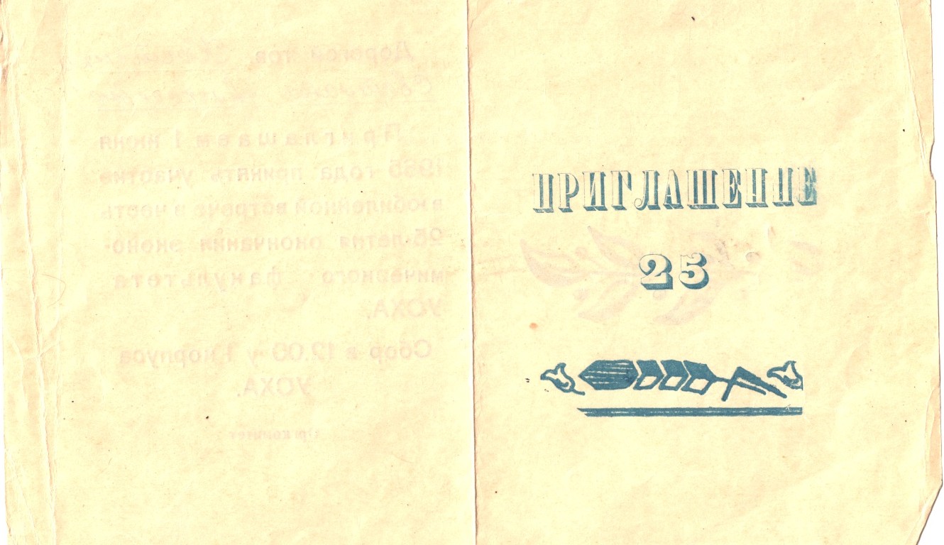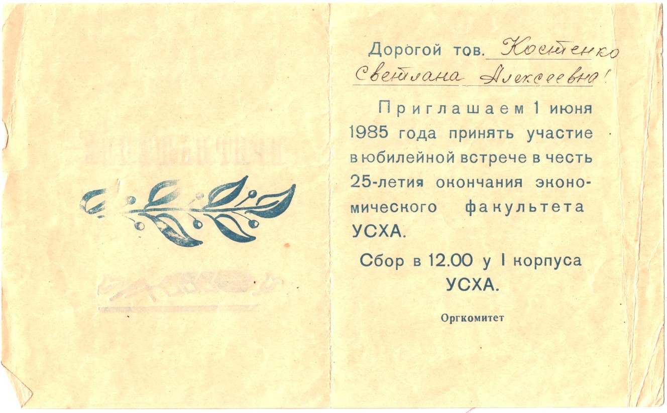 1985 рік. Запрошення на зустріч випускників факультету економіки та організації соціалістичного господарства. Випуск V (1955-1960 рр.)