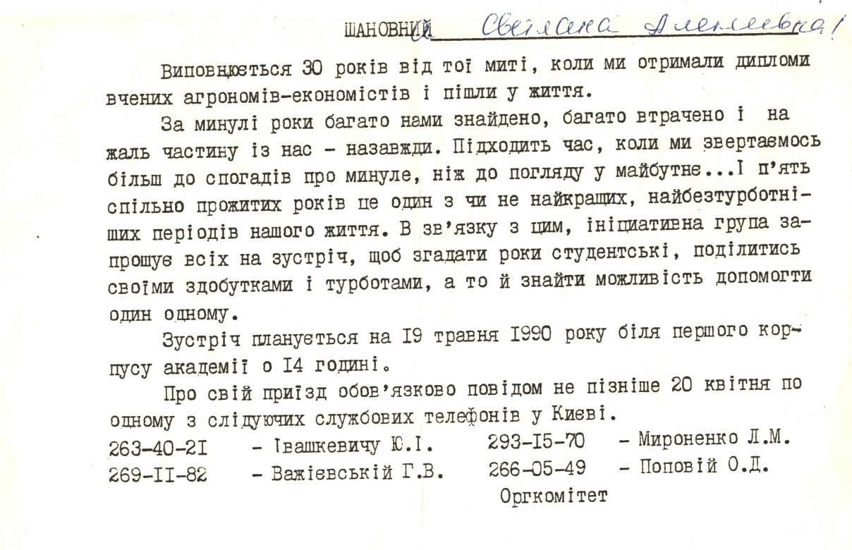 1990 рік. Запрошення на зустріч випускників факультету економіки та організації соціалістичного господарства. Випуск V (1955-1960 рр.)