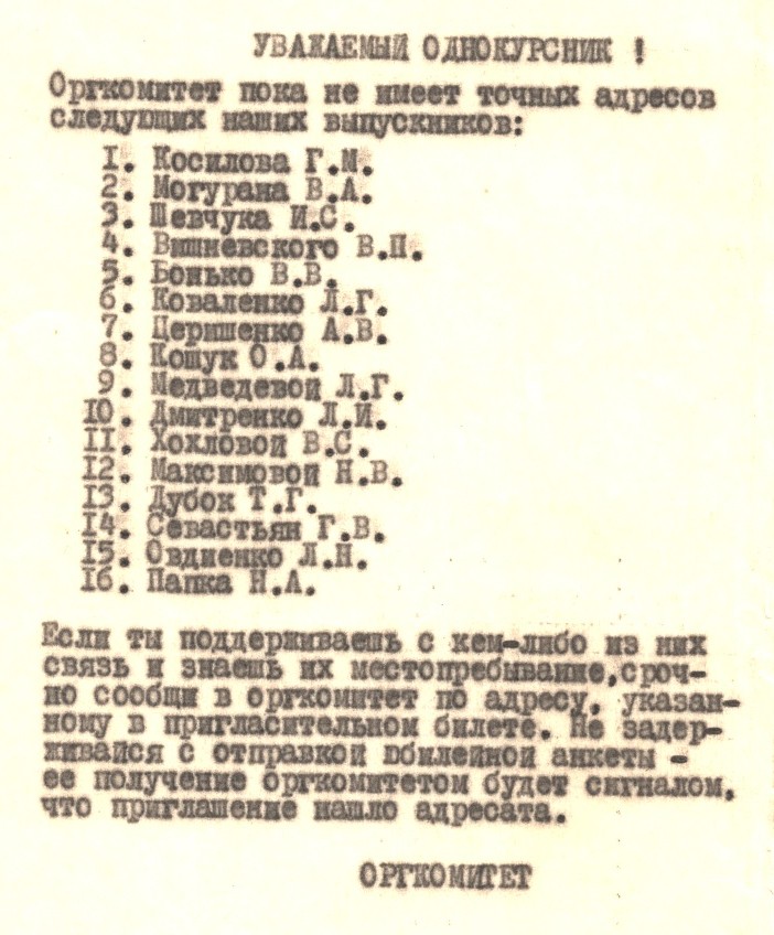 1970 рік. Запрошення на зустріч випускників факультету економіки та організації соціалістичного господарства. Випуск V (1955-1960 рр.)